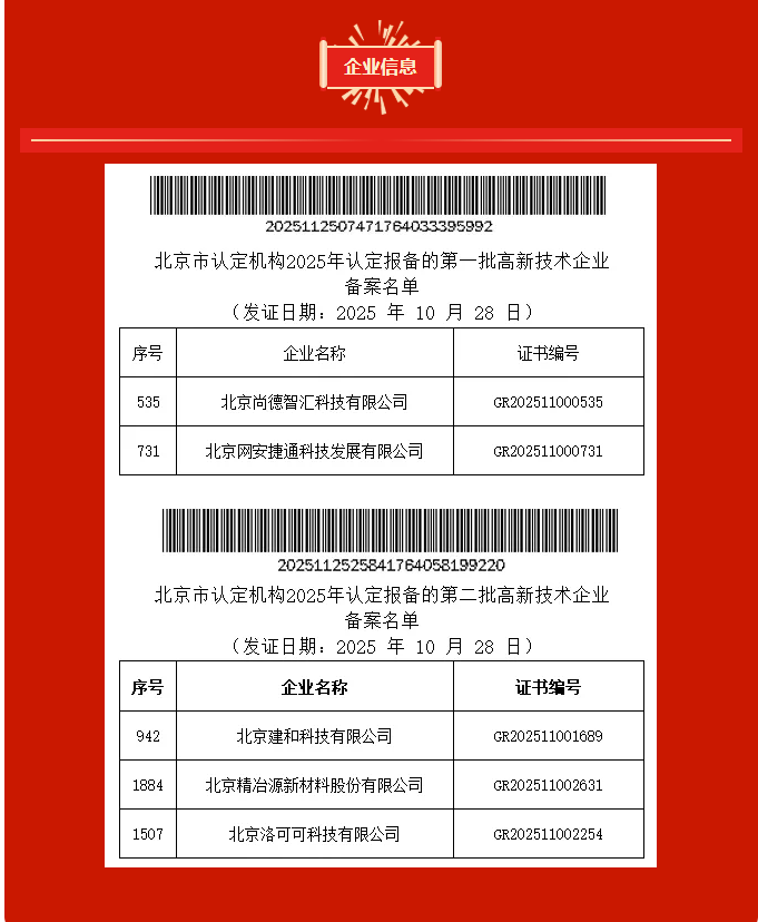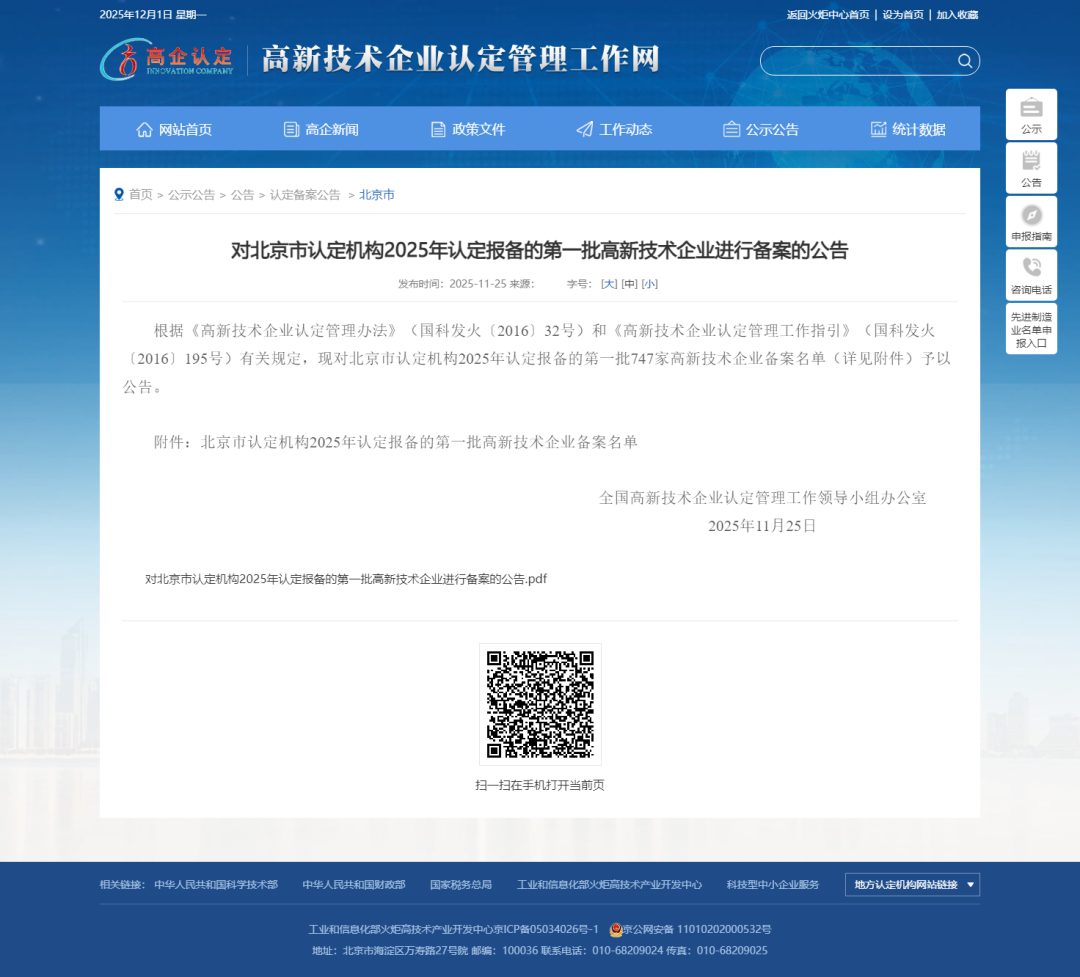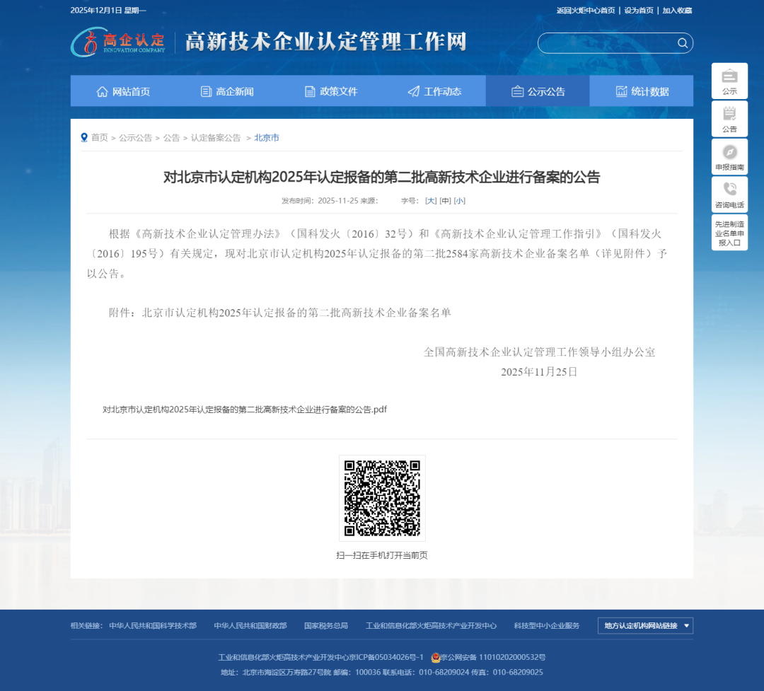 11月25日,高新技术企业认定管理工作网发出公告,《对北京市认定机构2025年认定报备的第一批高新技术企业进行备案的公告》、《对北京市认定机构2025年认定报备的第二批高新技术企业进行备案的公告》。金丰和孵化器5家在孵企业通过北京市认定机构2025年认定报备的第一批、第二批高新技术企业备案。