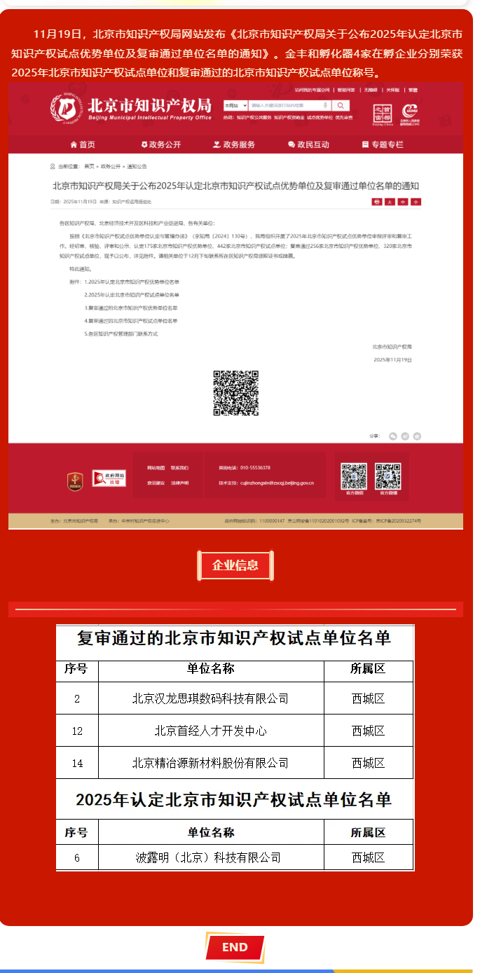 【企业动态】金丰和孵化器4家在孵企业荣获2025年认定北京市知识产权试点单位和复审通过的北京市知识产权试点单位称号