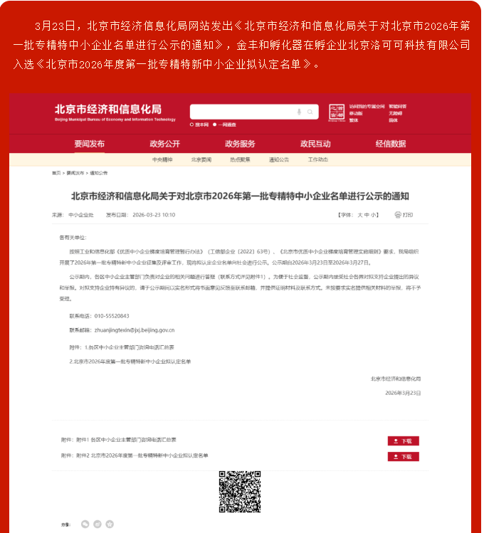 【企业动态】金丰和孵化器在孵企业北京洛可可科技有限公司入选北京市2026年度第一批专精特新中小企业拟认定名单